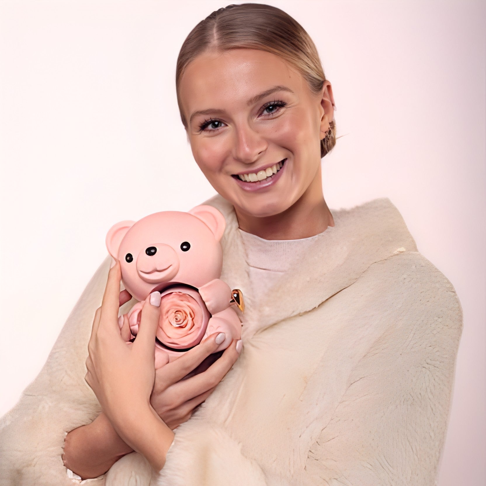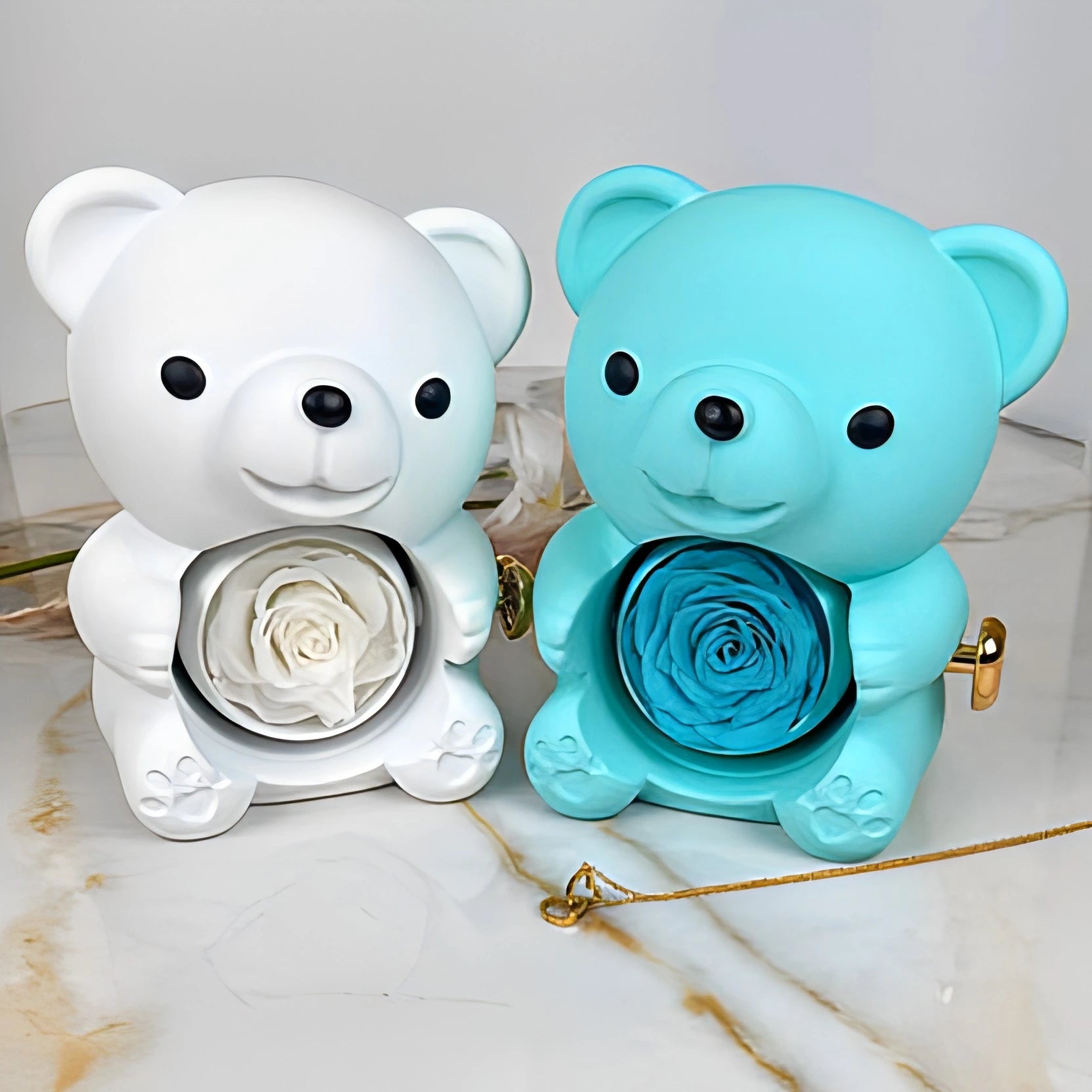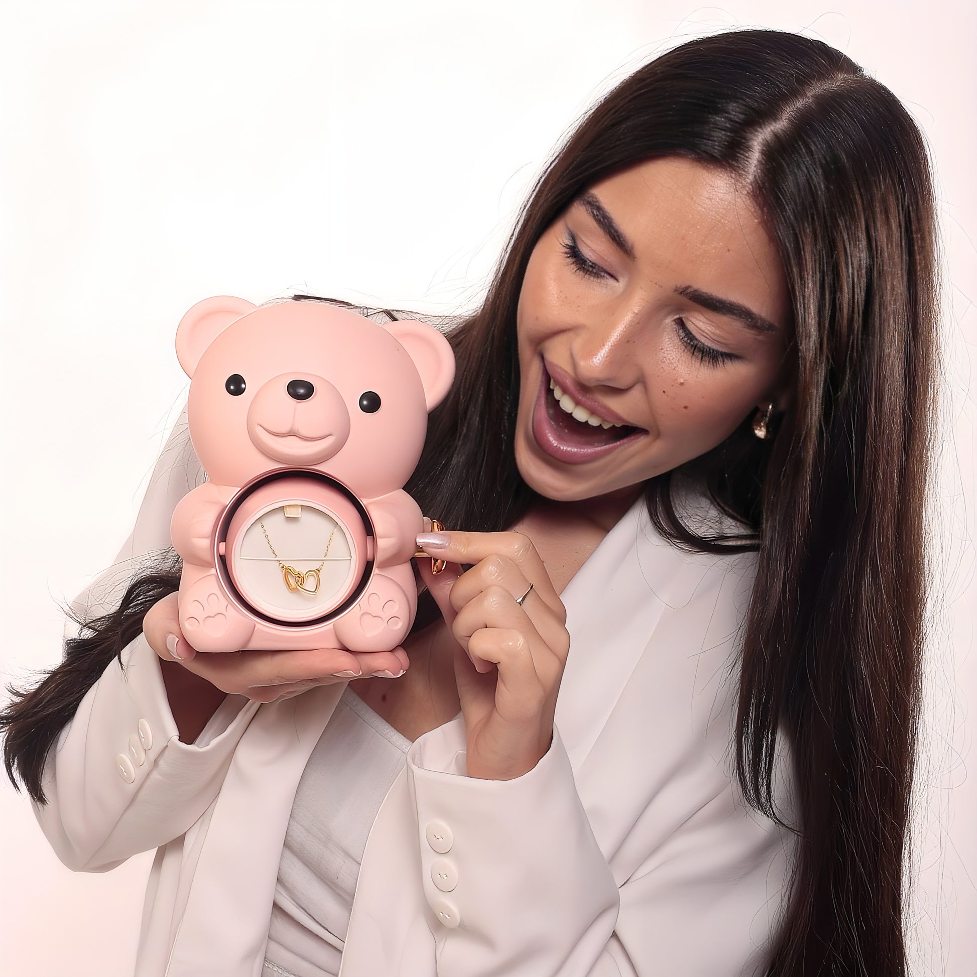Denna exklusiva presentask med evig björn innehåller en äkta, bevarad ros, symbolen för en kärlek som varar över tid. När hon försiktigt vrider på rosen upptäcker hon ett personligt halsband med två sammanflätade hjärtan, graverat enligt dina önskemål.
